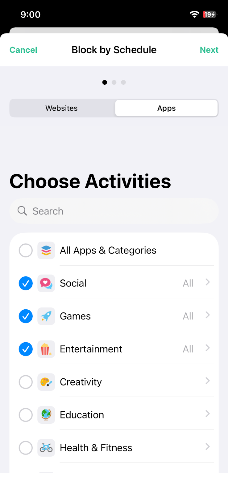 Scheduled blocking lets you block selected apps, websites, and keywords on specific days and hours.
