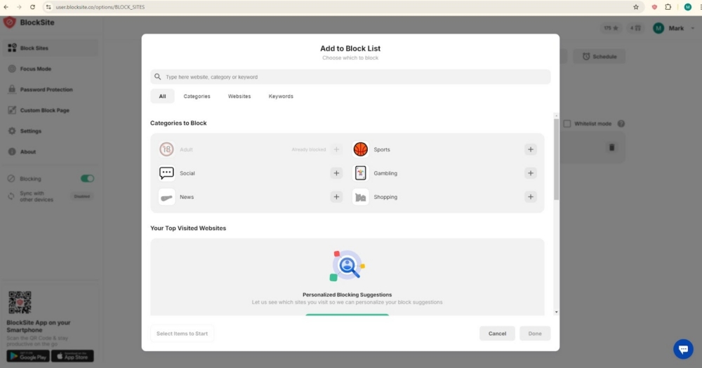 BlockSite lets you block individual websites (including the top blocked sites) or entire categories that repeatedly pull your attention away. Social platforms, news feeds, or entertainment sites can be restricted with a few clicks.